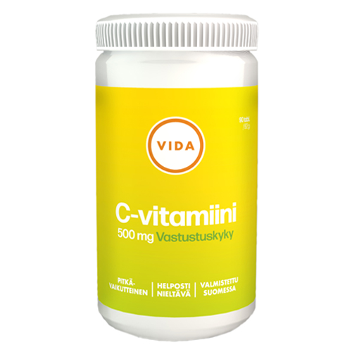 Vida C-vitamiini on pitkävaikutteinen: C-vitamiinia vapautuu jopa noin 8 tunnin ajan tabletin nauttimisesta. C-vitamiini toimii kehossa antioksidanttina, ja se mm. auttaa vähentämään väsymystä ja uupumusta sekä edistää immuunijärjestelmän normaalia toimintaa.