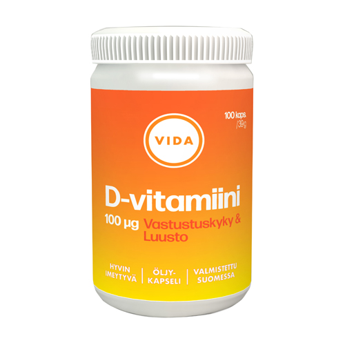 D-vitamiini edistää luiden pysymistä normaaleina sekä immuunijärjestelmän normaalia toimintaa. Tehostaa kalsiumin imeytymistä. Kotimainen ja helposti nieltävä Vidan D-vitamiini hyvin imeytyvässä öljykapselissa on noussut yhdeksi Suomen suosituimmista D-vitamiineista. Kapselissa oleva laadukas extra neitsytoliiviöljy tehostaa D-vitamiinin imeytymistä.