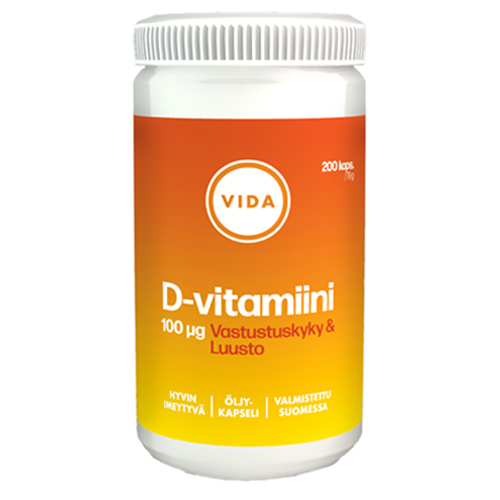 D-vitamiini edistää luiden pysymistä normaaleina sekä immuunijärjestelmän normaalia toimintaa. Tehostaa kalsiumin imeytymistä. Kotimainen ja helposti nieltävä Vidan D-vitamiini hyvin imeytyvässä öljykapselissa on noussut yhdeksi Suomen suosituimmista D-vitamiineista. Kapselissa oleva laadukas extra neitsytoliiviöljy tehostaa D-vitamiinin imeytymistä.