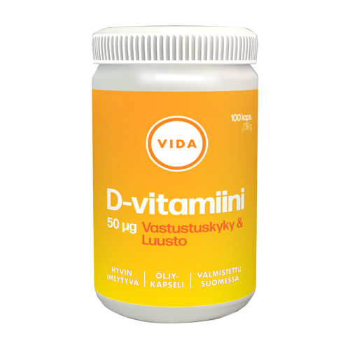D-vitamiini edistää luiden pysymistä normaaleina ja immuunijärjestelmän normaalia toimintaa. Tehostaa kalsiumin imeytymistä. Kotimainen ja helposti nieltävä Vidan D-vitamiini hyvin imeytyvässä öljykapselissa on noussut yhdeksi Suomen suosituimmista D-vitamiineista. Pienessä helposti nieltävässä kapselissa oleva laadukas extra neitsytoliiviöljy tehostaa D-vitamiinin imeytymistä.