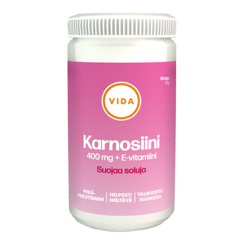 Pitkävaikutteinen Vida Karnosiini sisältää myös luonnollista E-vitamiinia. Karnosiini on kahden aminohapon, β-alaniinin ja histidiinin muodostama dipeptidi, jota ihmisessä on luonnostaan muun muassa lihaksistossa, maksassa ja aivoissa.