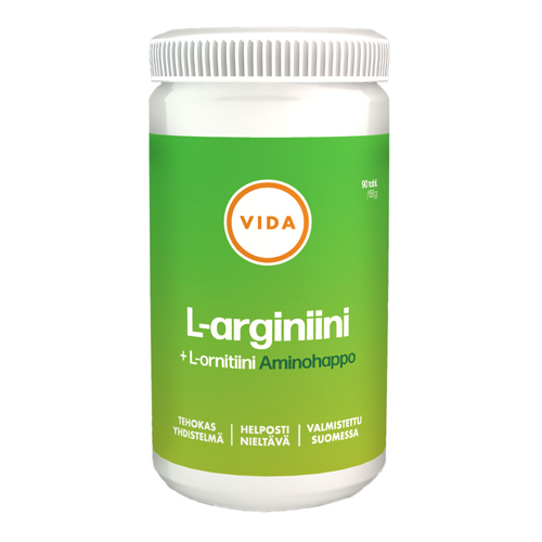 Kotimaisen Vida Arginiini- ja ornitiiniaminohapot ovat toisiaan täydentäviä aminohappoja. Typpioksidi on arginiinin aineenvaihduntatuote. Tehokkaan yhdistelmän lisäksi tabletti on helposti nieltävä.