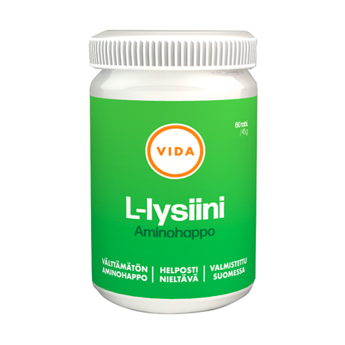 Vida L-lysiini ravintolisä. Lysiini on ihmiselle välttämätön aminohappo, jota on saatava ravinnosta. Valmiste soveltuu myös vegaaneille.