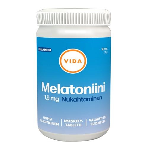 Vida melatoniini imeskelytabletti lisää melatoniinin määrää elimistössä ja helpottaa nukahtamista, suun limakalvoilta melatoniini imeytyy nopeammin kuin suolistosta. Melatoniinia erittyy elimistöön muutaman tunnin ajan valmisteen nauttimisen jälkeen.