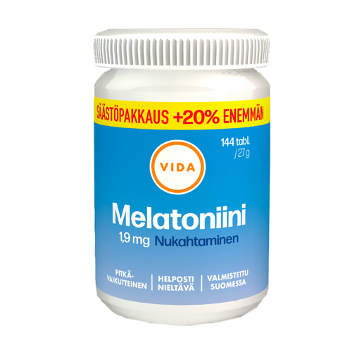 Vida Melatoniini lisää melatoniinin määrää elimistössä ja helpottaa nukahtamista. Pitkävaikutteinen melatoniini on depottabletti, joka vapauttaa melatoniinia hitaasti ja jäljittelee näin elimistön omaa hormonieritystä.