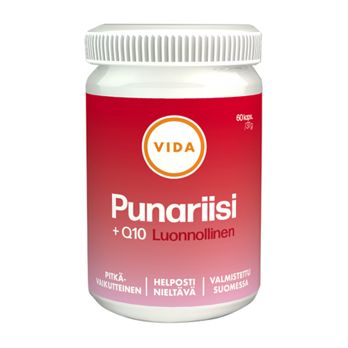 Vida Punariisi ja ubikinoni on luonnollinen ja pitkävaikutteinen ravintolisä. Mahahappoja kestävän kapselin hidas hajoaminen mahdollistaa vatsaystävällisyyden sekä parhaan mahdollisen imeytymisen. Väriaineeton kapseli on kasvikuitua.