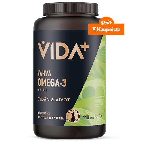 Runsaasti elintärkeitä EPA ja DHA rasvahappoja sisältävä Vida plus -sarjan Vahva Omega-3 + A- ja E-vitamiini valmiste auttaa huolehtimaan sydämen ja aivojen hyvinvoinnista. Erityisesti DHA on määrällisesti tärkein Omega-3 rasvahappo aivojen toiminnalle.